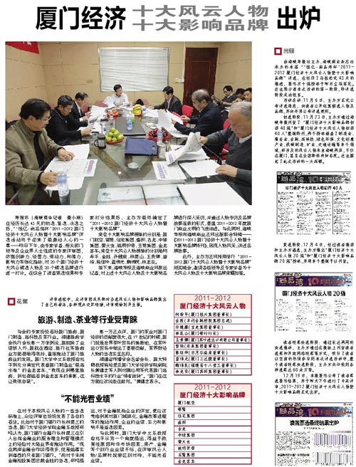 12月20日被業(yè)界稱為閩南經(jīng)濟(jì)領(lǐng)域“奧斯卡”獎的“2011-2012廈門經(jīng)濟(jì)十大風(fēng)云人物”評選結(jié)果揭曉,三達(dá)膜環(huán)境技術(shù)股份有限公司董事長兼總經(jīng)理藍(lán)偉光博士等十位商業(yè)精英成功當(dāng)選。本次評選由海峽導(dǎo)報(bào)、海峽商業(yè)、臺灣海峽競爭力論壇主辦,已成功舉辦三屆,評選邀請了廈門的權(quán)威經(jīng)濟(jì)學(xué)家、行業(yè)協(xié)會資深人士、媒體傳播界專業(yè)人士及社會知名人士組成評審委員會,通過影響力、創(chuàng)新力、經(jīng)營力、和諧力和帶動力等五個(gè)細(xì)化指標(biāo)進(jìn)行考核,歷時(shí)43天、主辦方收到的報(bào)紙和網(wǎng)絡(luò)的總決選票達(dá)到618,653張。